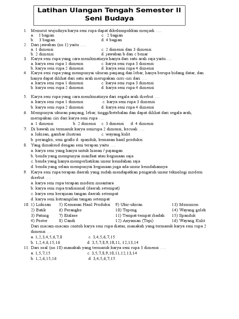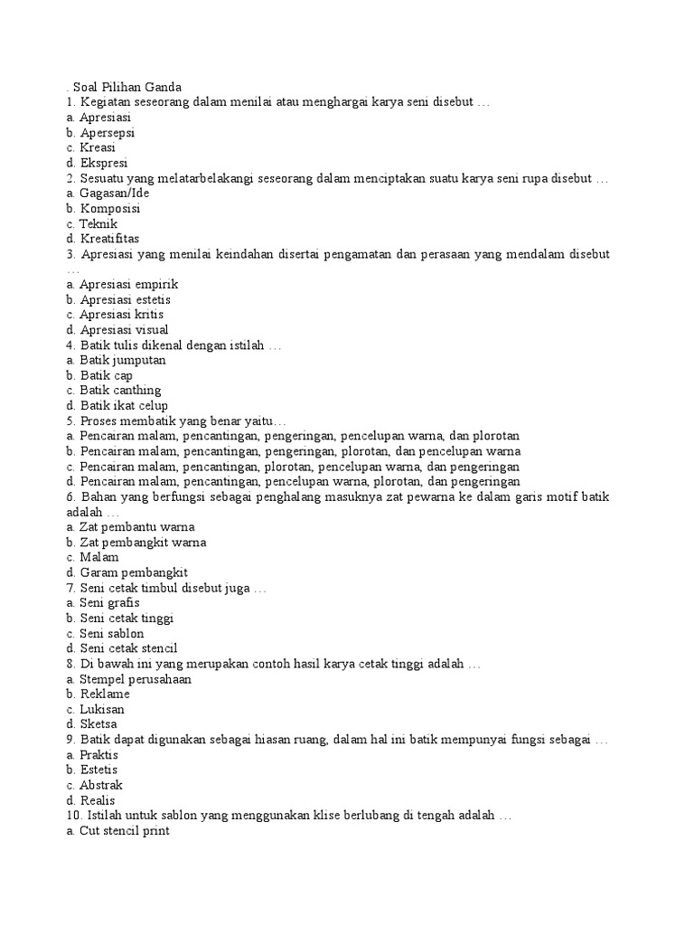 Contoh Soal Seni Rupa 3 Dimensi Pilihan Ganda Contoh Soal Terbaru from imgv2-2-f.scribdassets.com Check spelling or type a new query. We did not find results for: Contoh soal pg seni rupa 3 dimensi dan jawabannya. Maybe you would like to learn more about one of these?