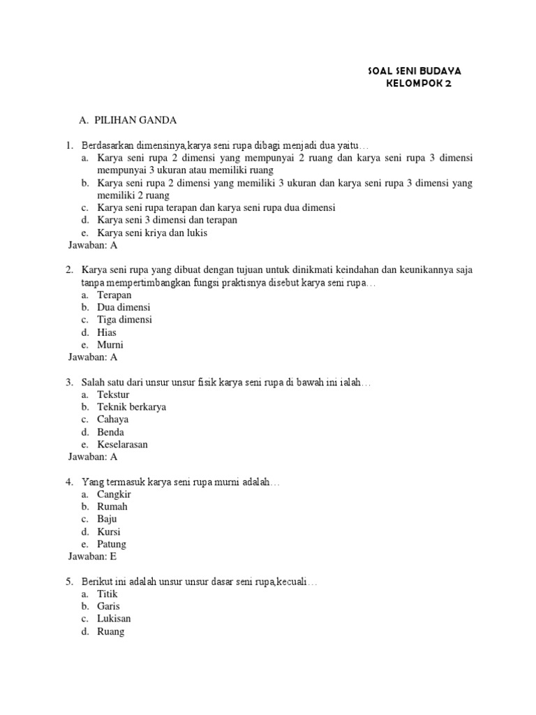 Contoh Soal Seni Budaya Beserta Jawabannya 1 Gurumapel from 1.bp.blogspot.com Contoh soal pg seni rupa 3 dimensi dan jawabannya. Maybe you would like to learn more about one of these? We did not find results for: Check spelling or type a new query.